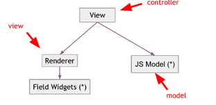 Les vistes en el Javascript tenen també el MVC. El arxiu i classe view defineix la vista i carrega el MVC, de manera que està l'arxiu model, controller i renderer. El renderer representa la V en el model-vista-controlador.