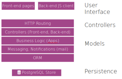 • La capa ORM (Object Relational Mapping) entre els objectes Python i la base de dades PostgreSQL. El dissenyador-programador no efectua el disseny de la base de dades; únicament dissenya classes, per les quals la capa ORM d’Odoo n’efectuarà el mapat sobre el SGBD PostgreSQL.